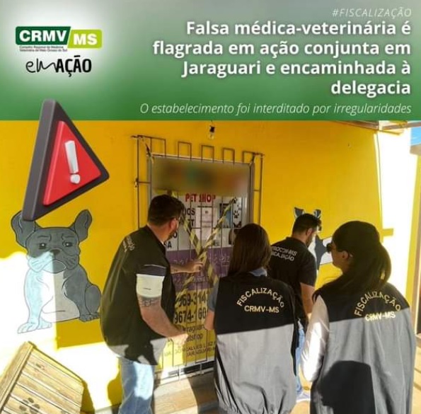 O CRMV-MS identificou um caso de exercício ilegal da profissão e tomou medidas em conjunto com a Delegacia Especializada de Repressão aos Crimes Contra as Relações de Consumo (DECON), após receber denúncias sobre uma falsa médica veterinária que estava atendendo em estabelecimentos comerciais e domiciliares em Jaraguari-MS.