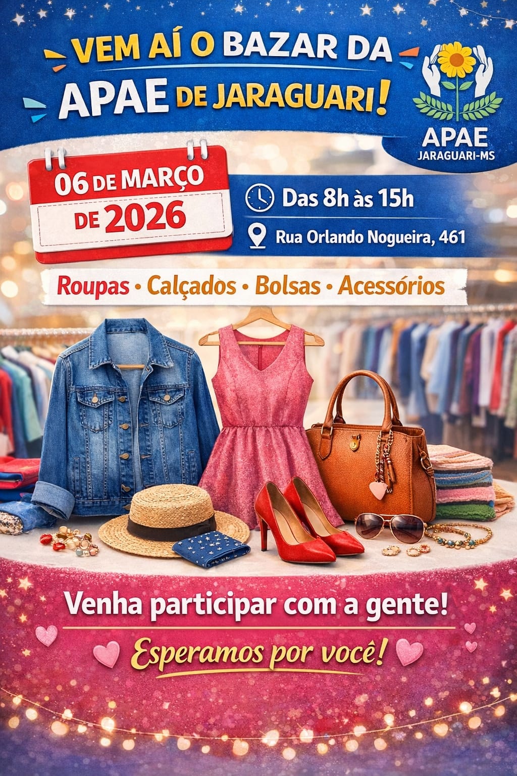 A Associação de Pais e Amigos dos Excepcionais (APAE) de Jaraguari realiza nesta sexta-feira, 6 de março de 2026, um bazar solidário aberto à comunidade. O evento acontece das 8h às 15h, na Rua Orlando Nogueira, nº 461.
